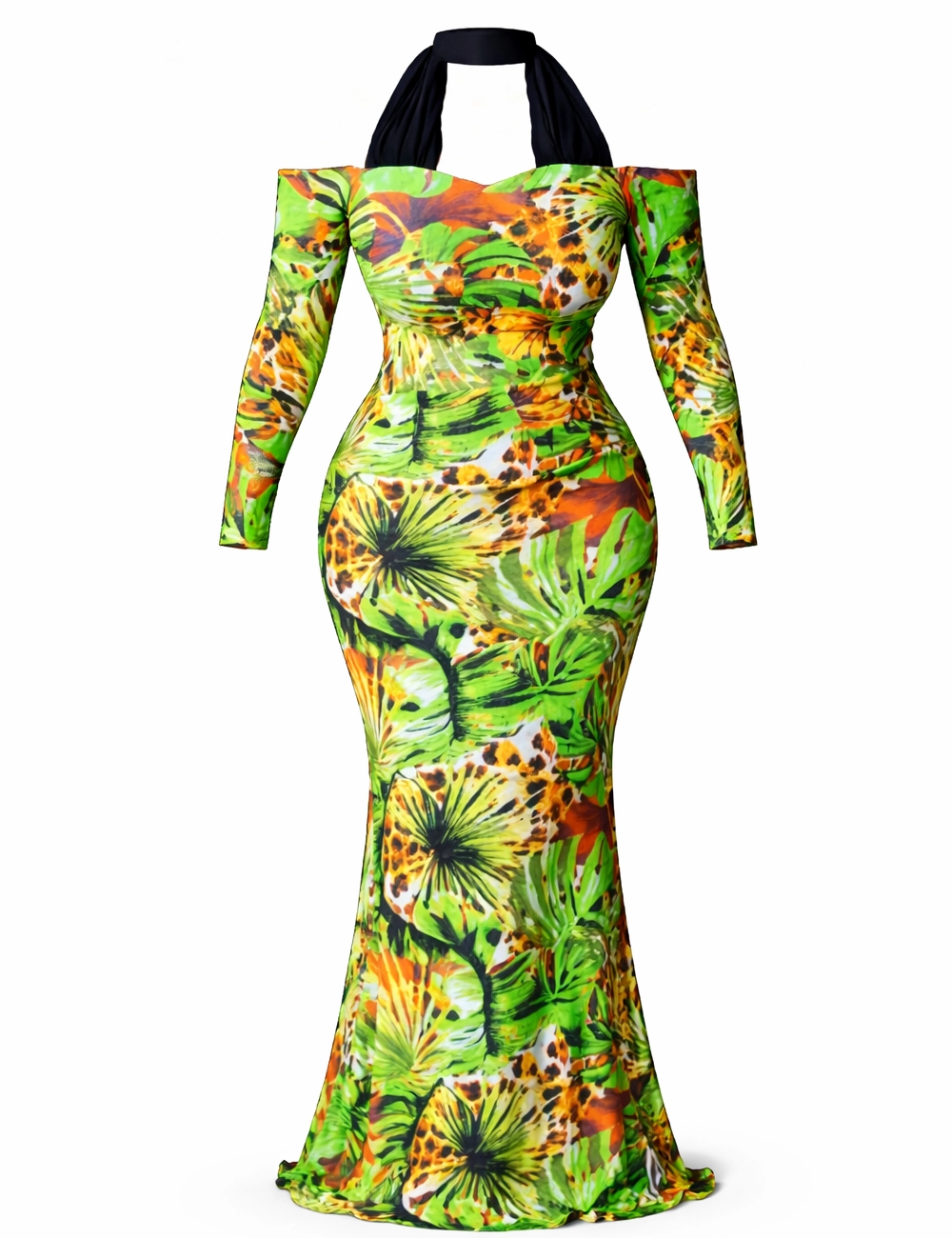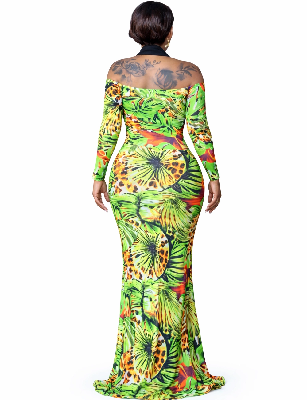 Step into luxury with this bold, figure-hugging off-shoulder maxi dress featuring a vibrant tropical print and elegant long sleeves. Designed to highlight your curves, it’s the perfect outfit for special occasions and standout moments.